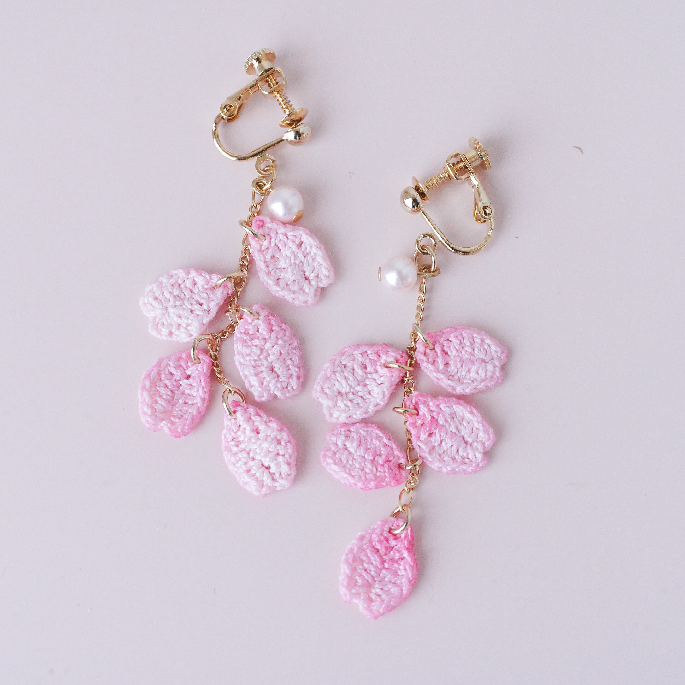 桜の花弁をイメージしたモチーフをレース糸で編んで1つ1つ着色したものを組み合わせました