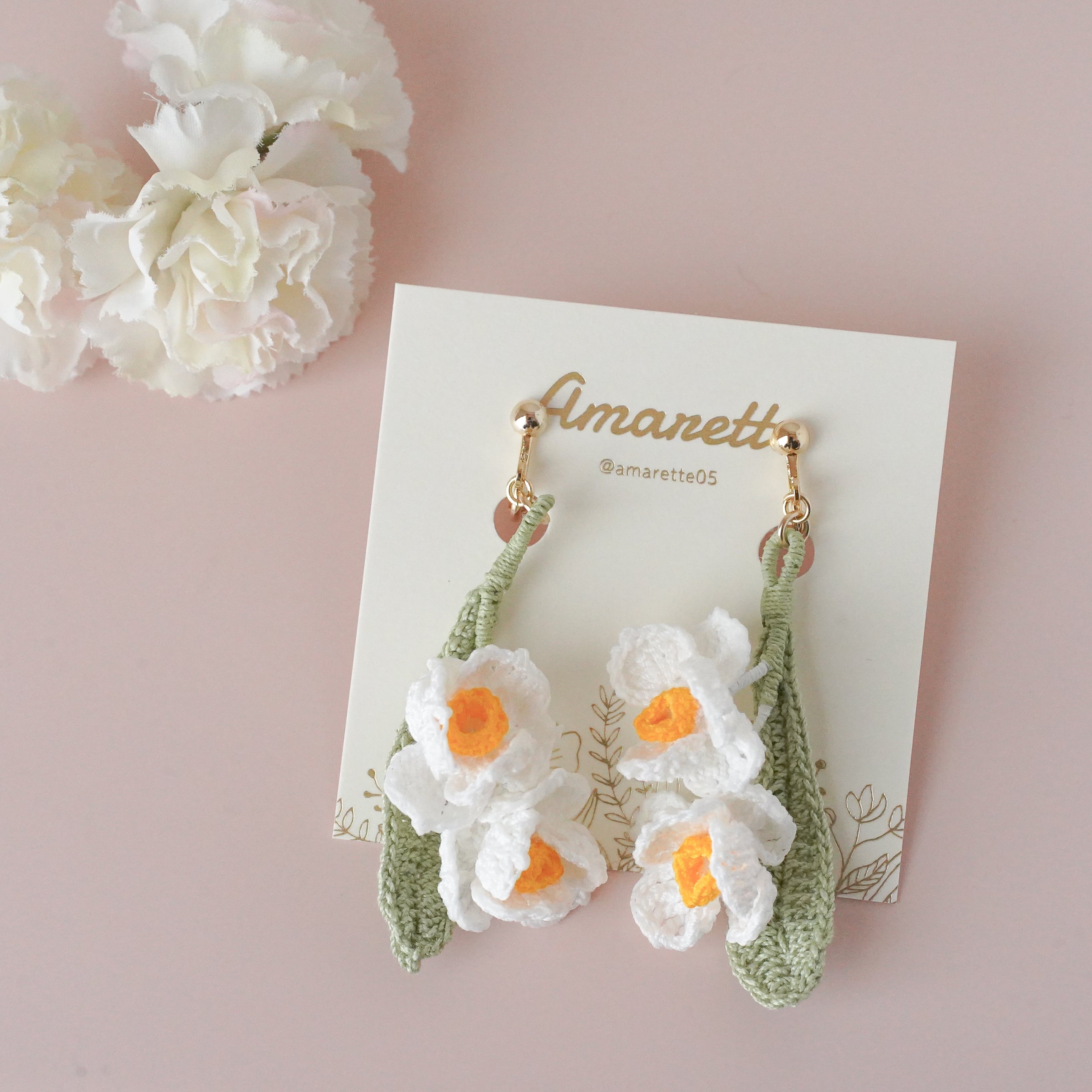 水仙モチーフをレース糸で編んで1つ1つ着色したものを組み合わせました。