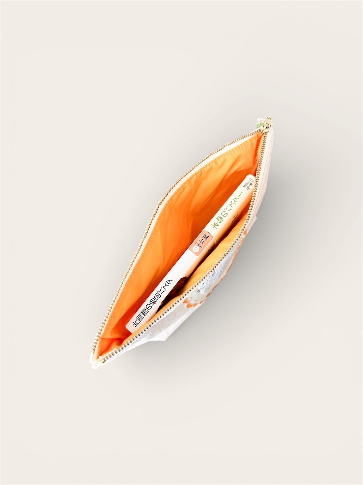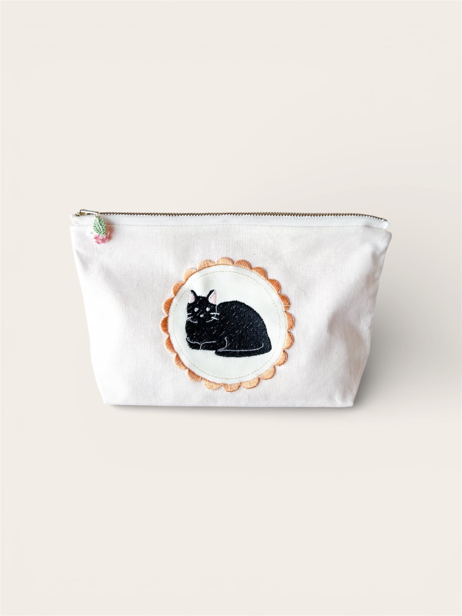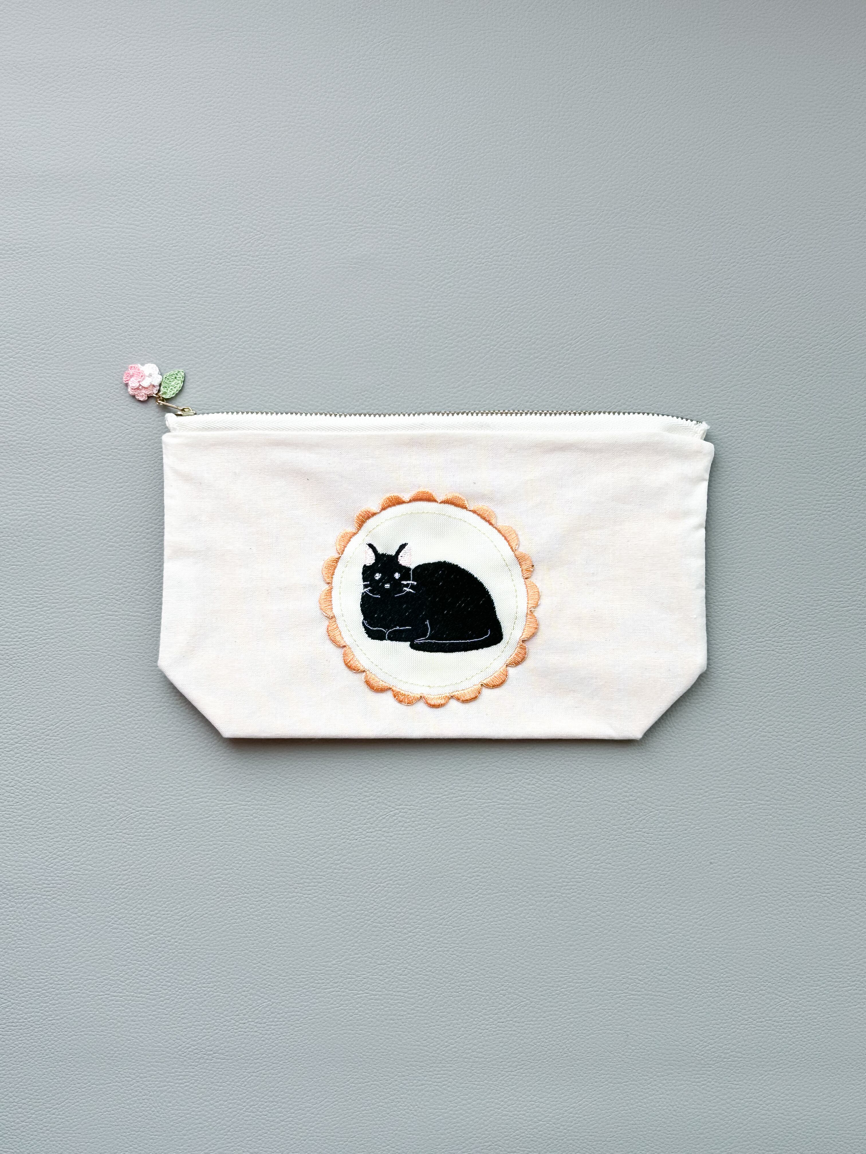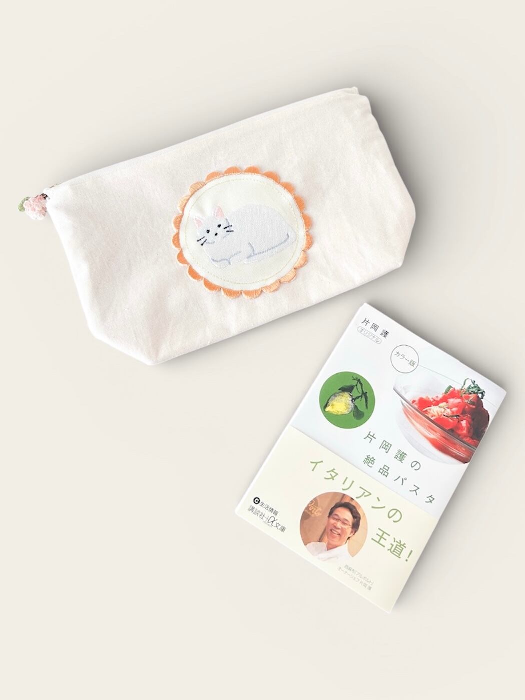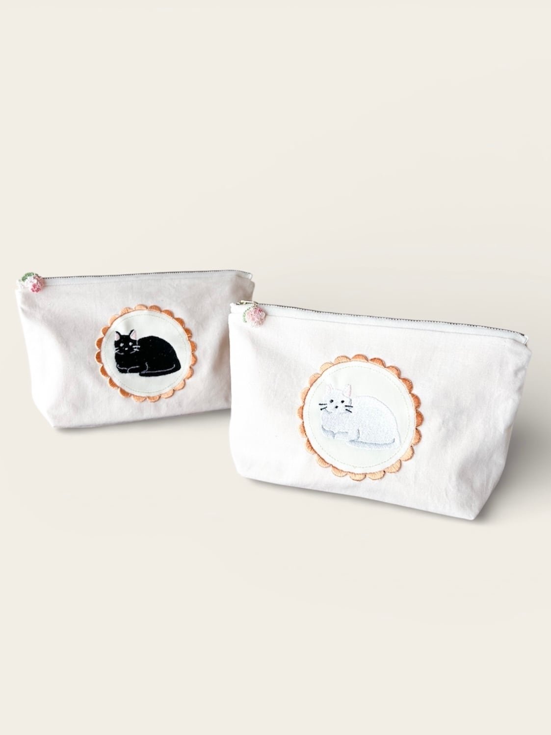 フェルト素材にミシンで刺繍を施したアップリケがついたファスナーポーチになります。