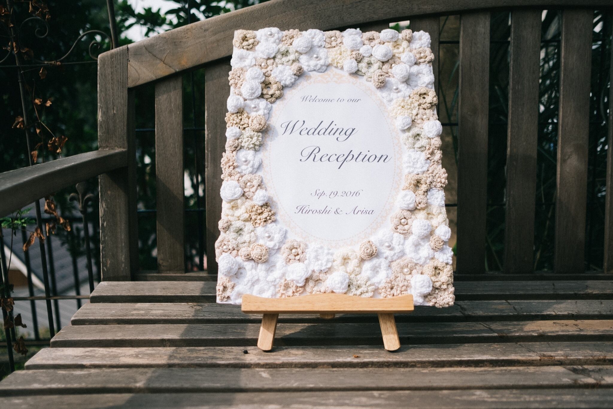 レース編みで作ったクロッシェフラワーモチーフを使用して作ったウェルカムボードです。