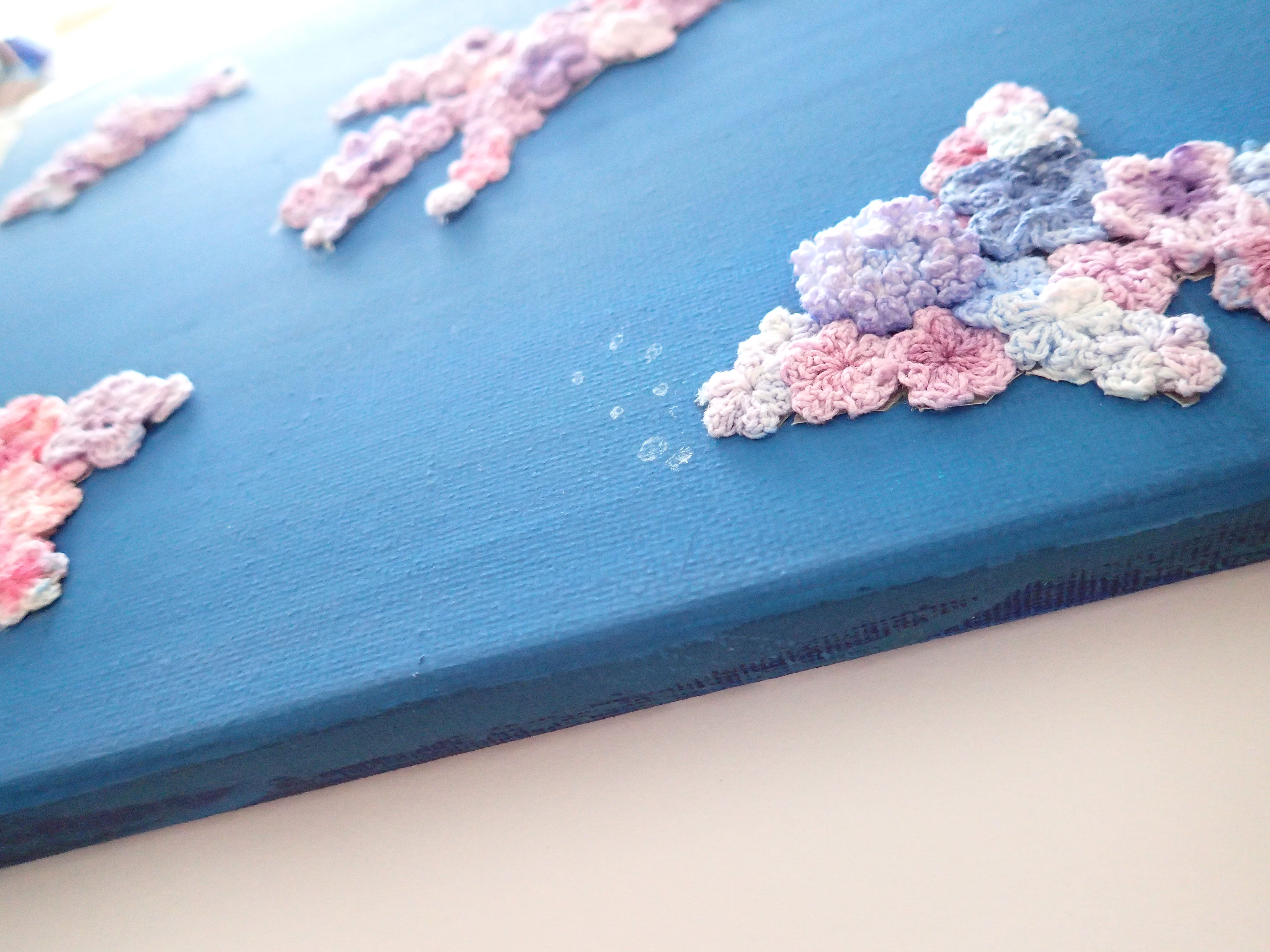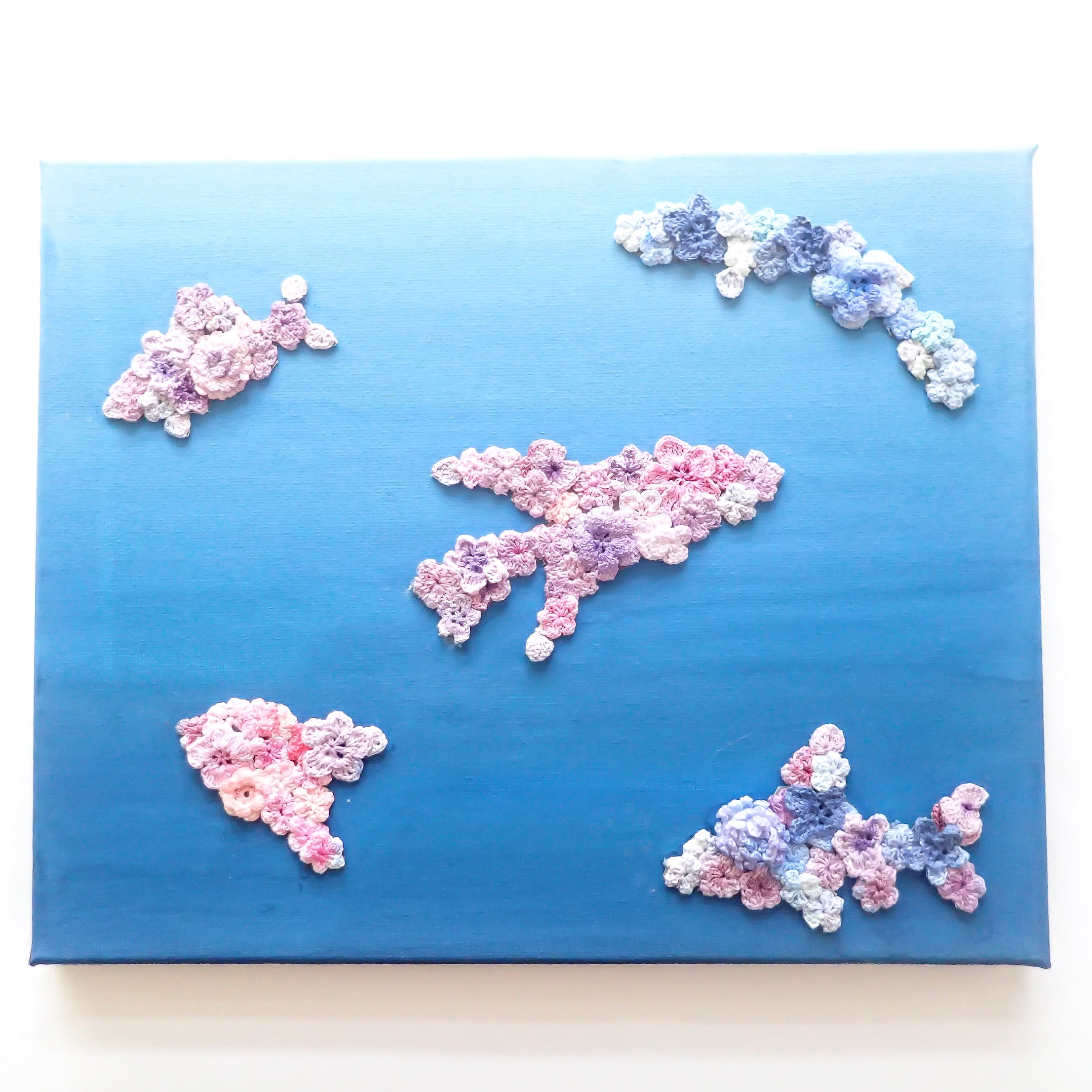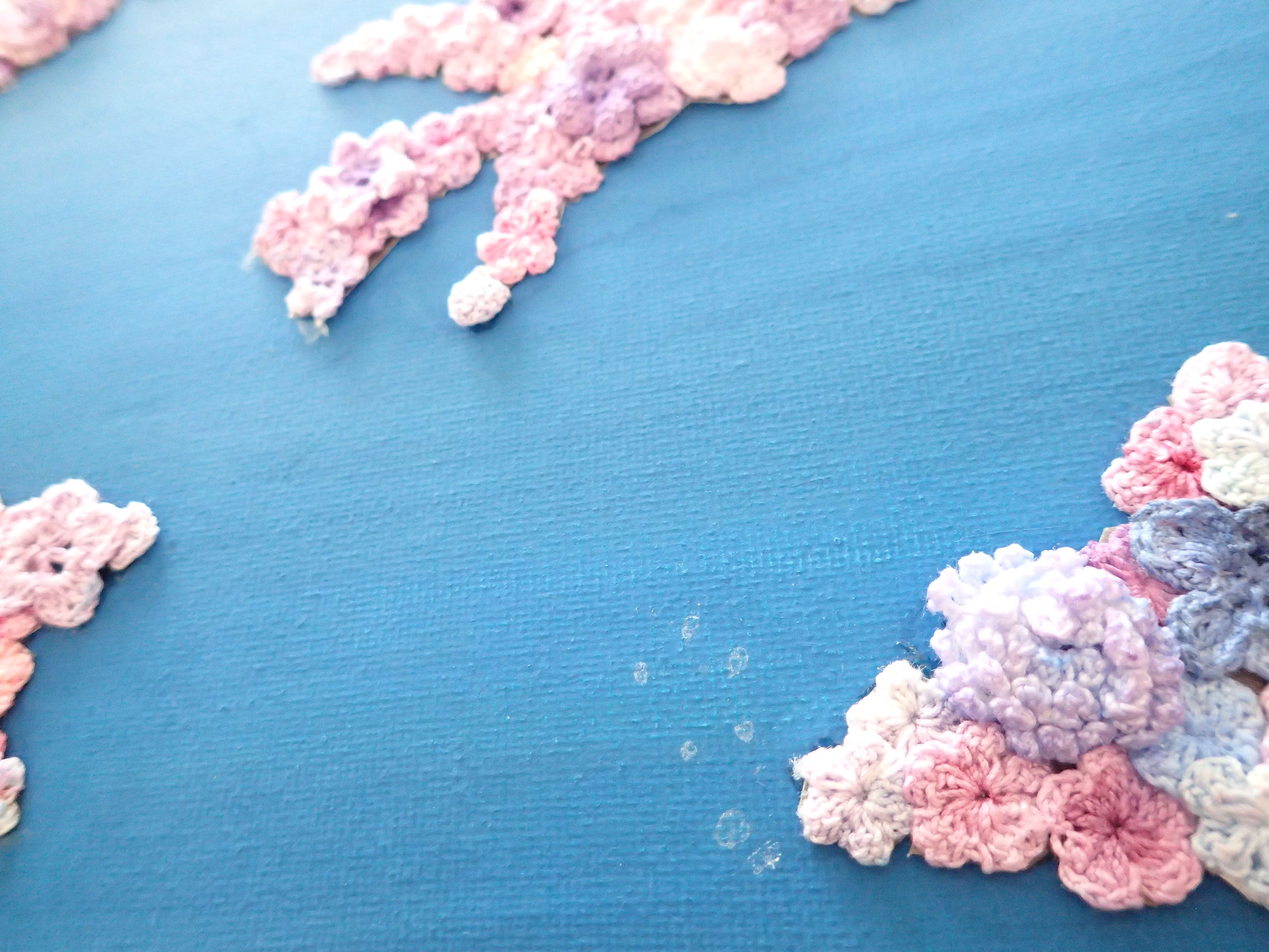 クロッシェフラワーモチーフを使用したキャンバスアートになります。