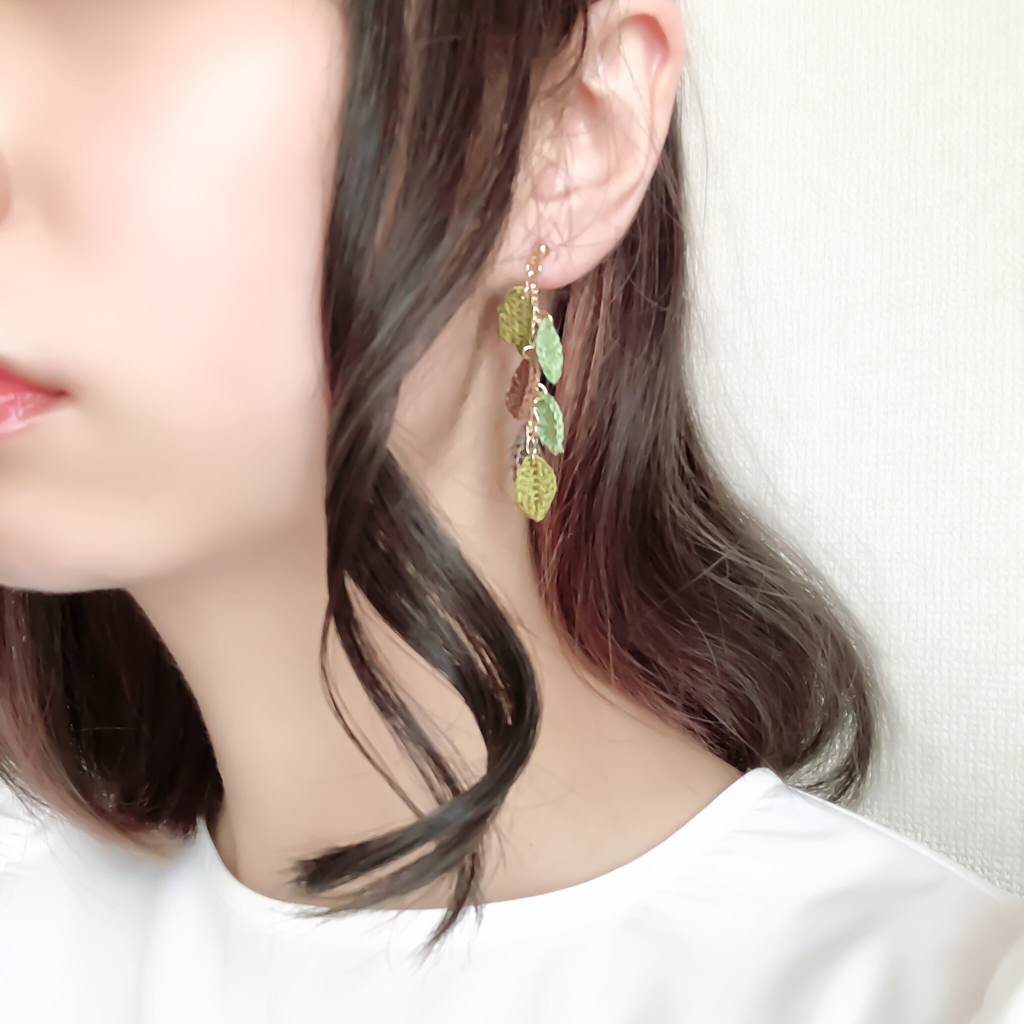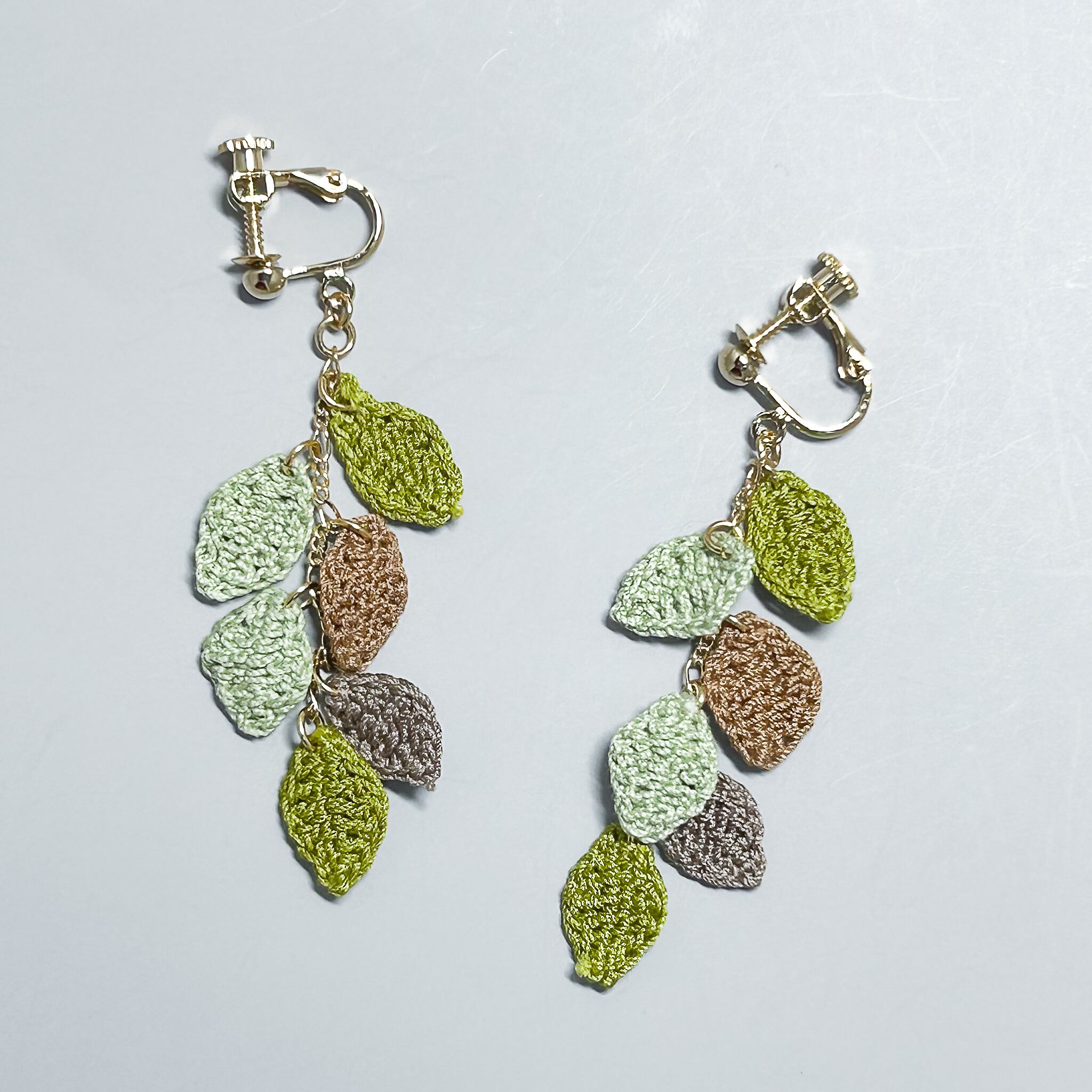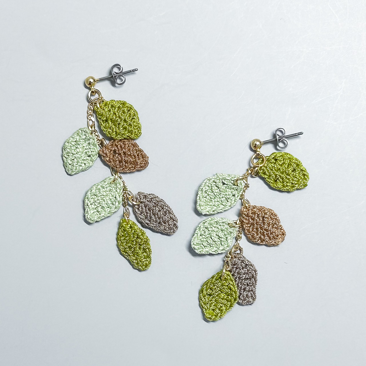 レース糸で編んだ葉っぱのピアス/イヤリングです。