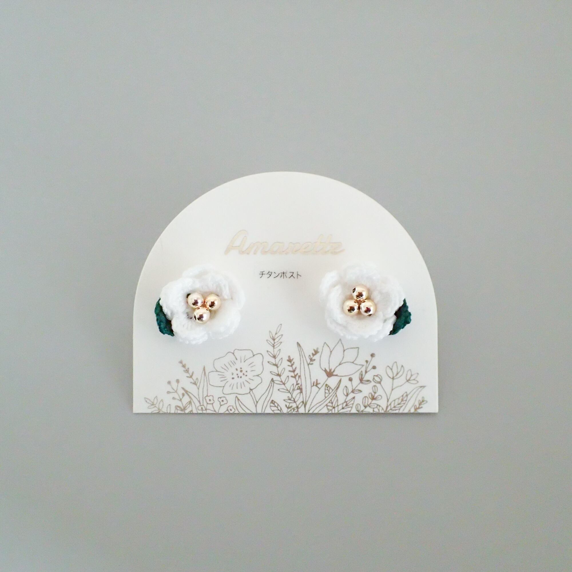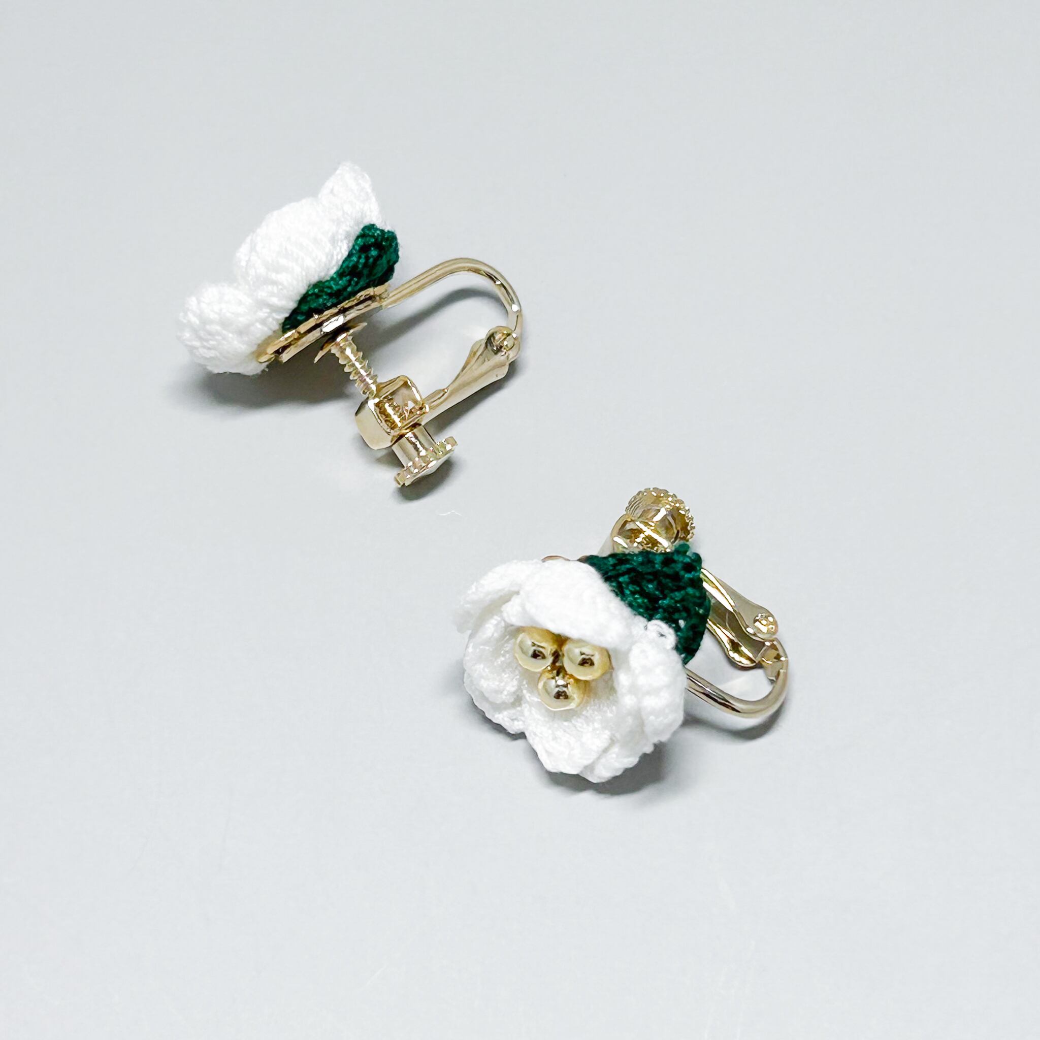 極細のレース糸で編んだ椿のピアス/イヤリングです。