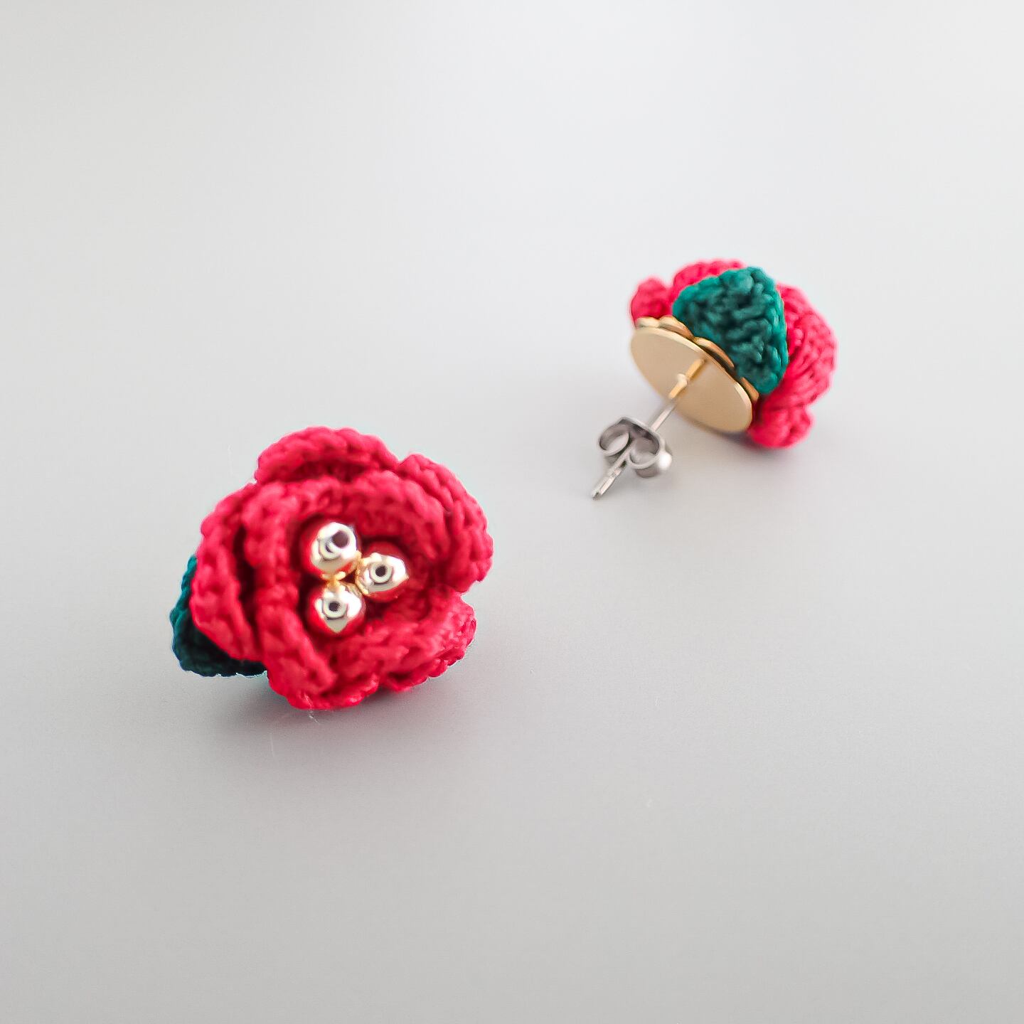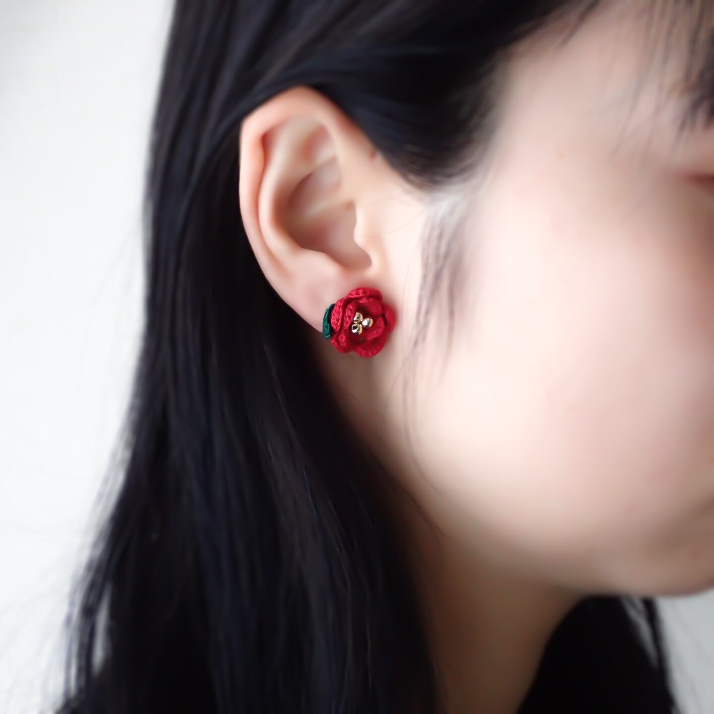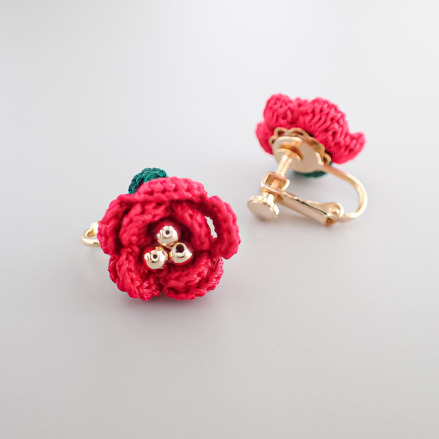 レース糸で編んだ椿のピアス/イヤリングです。