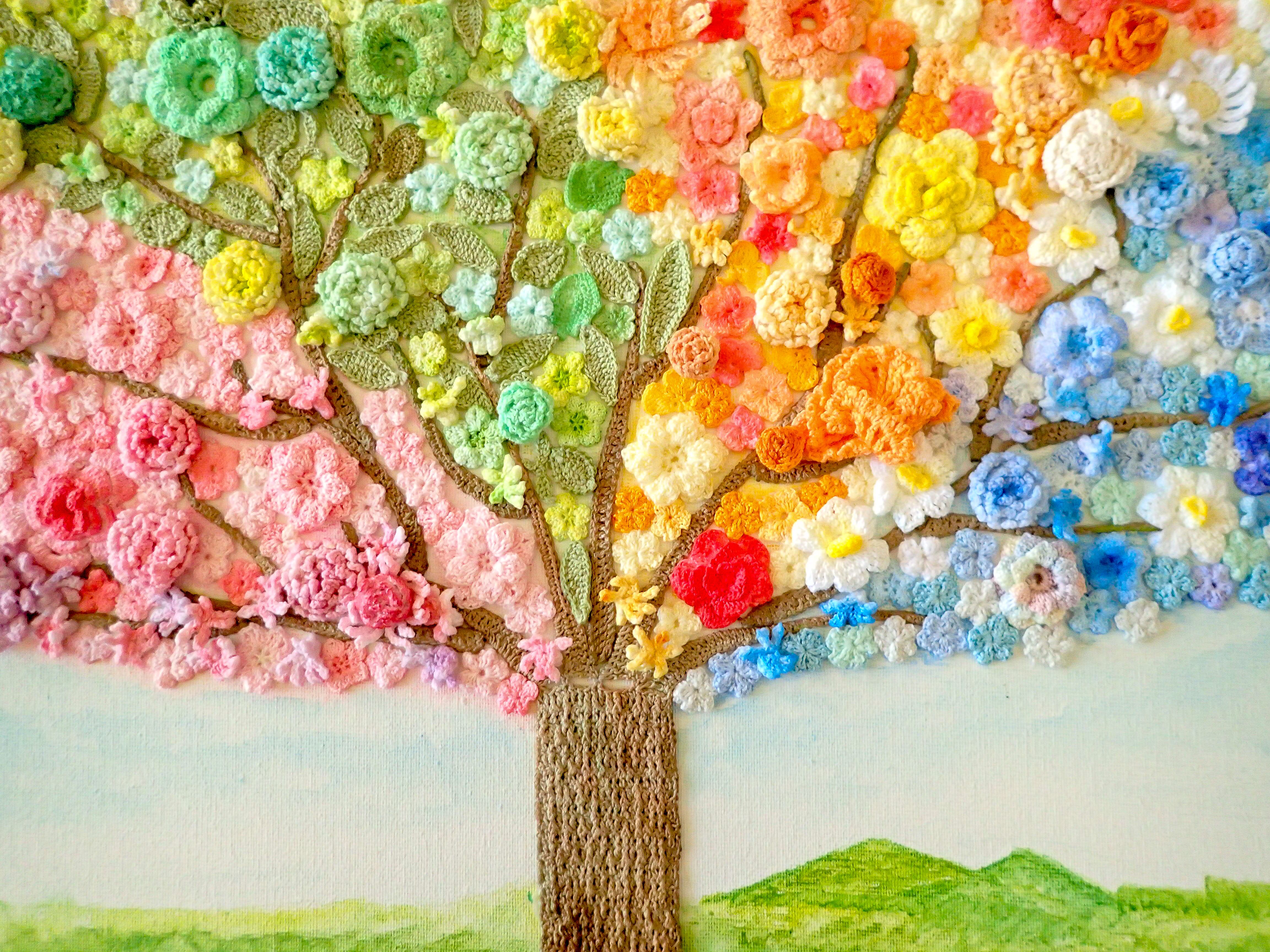 組み合わせたクロッシェモチーフを着色し、四季をイメージした樹木を表現しました。