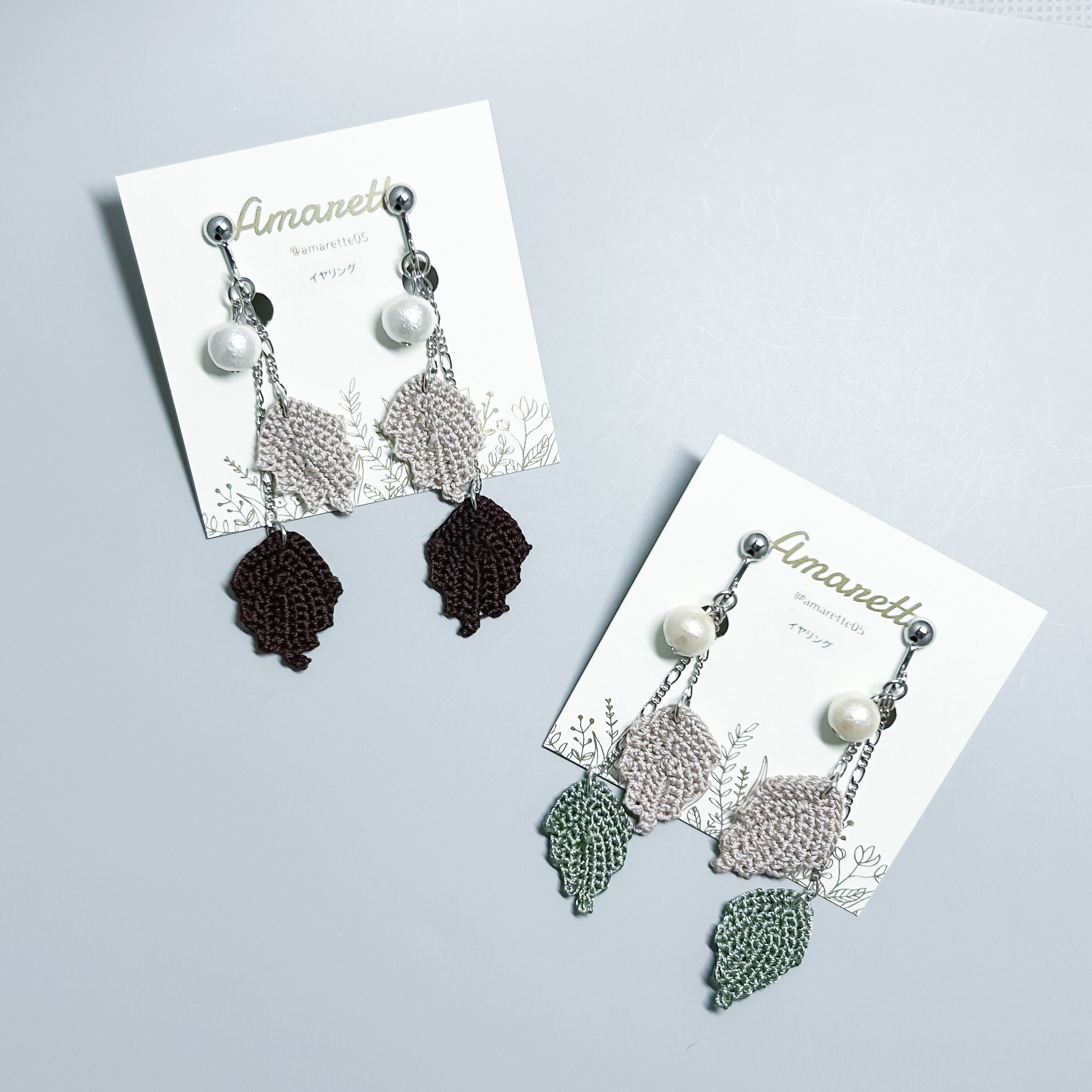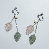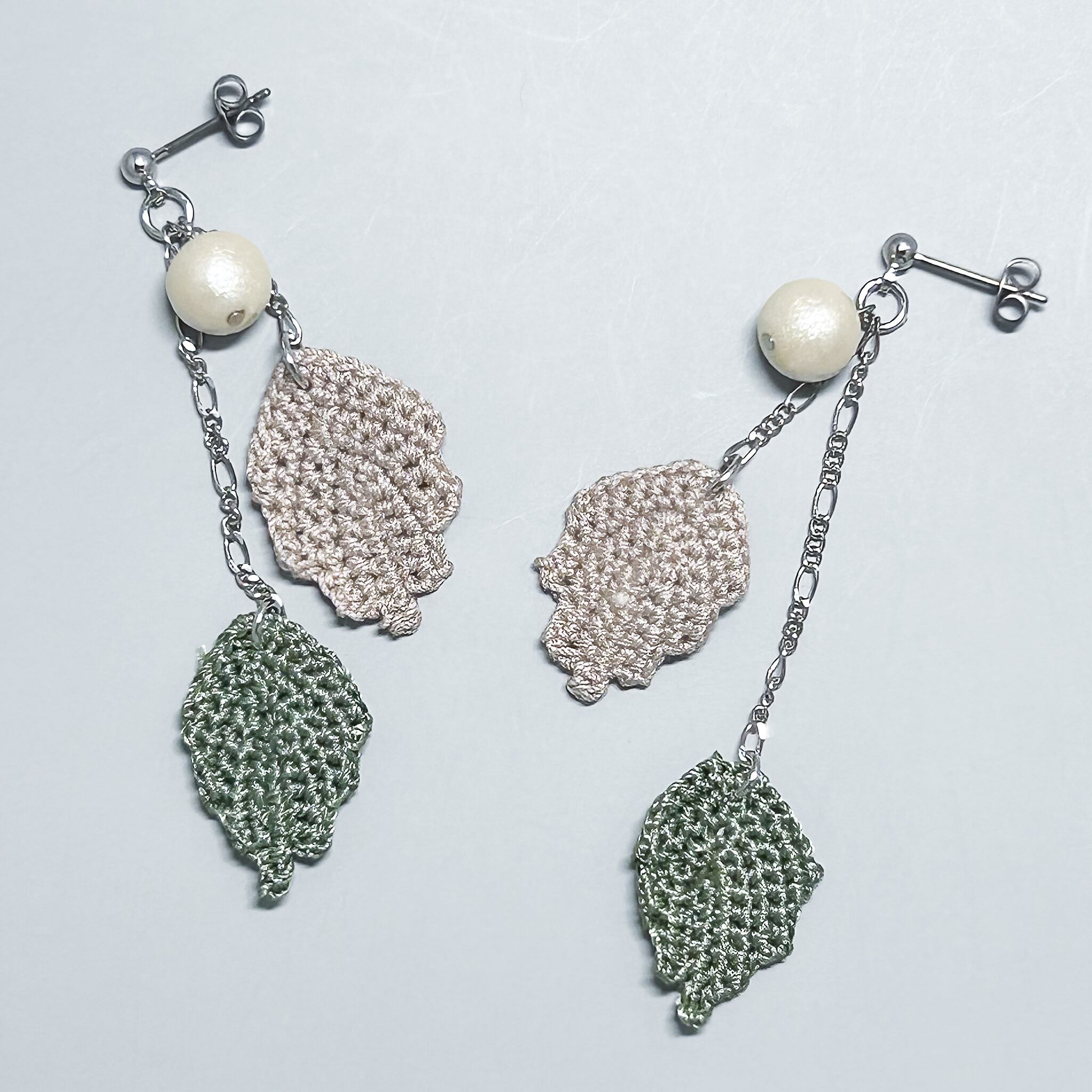 レース糸で編んだ葉とコットンパールのピアス/イヤリングです。