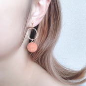 レース糸で編んだクロッシェボールと大きめリングのピアス/イヤリングです。