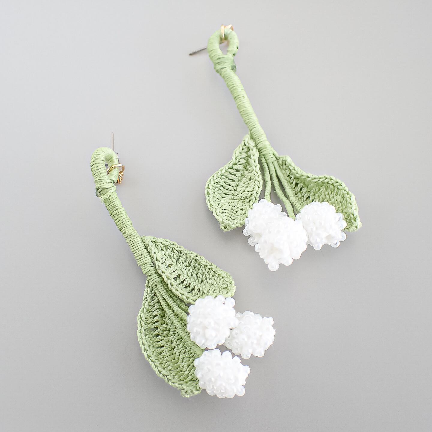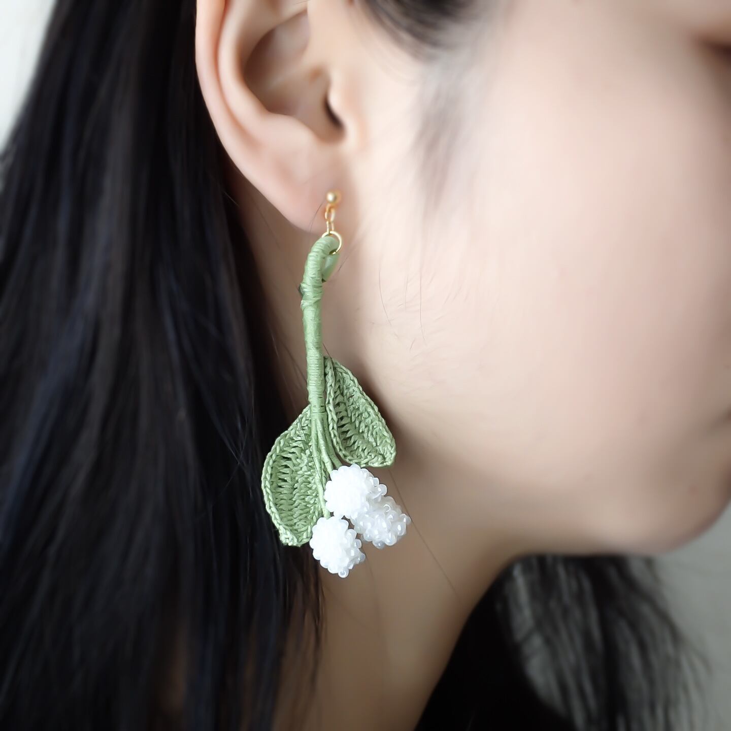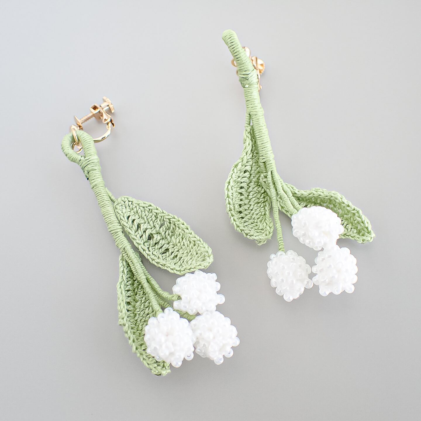 ビーズクロッシェで編んだスズランのピアス/イヤリングです。