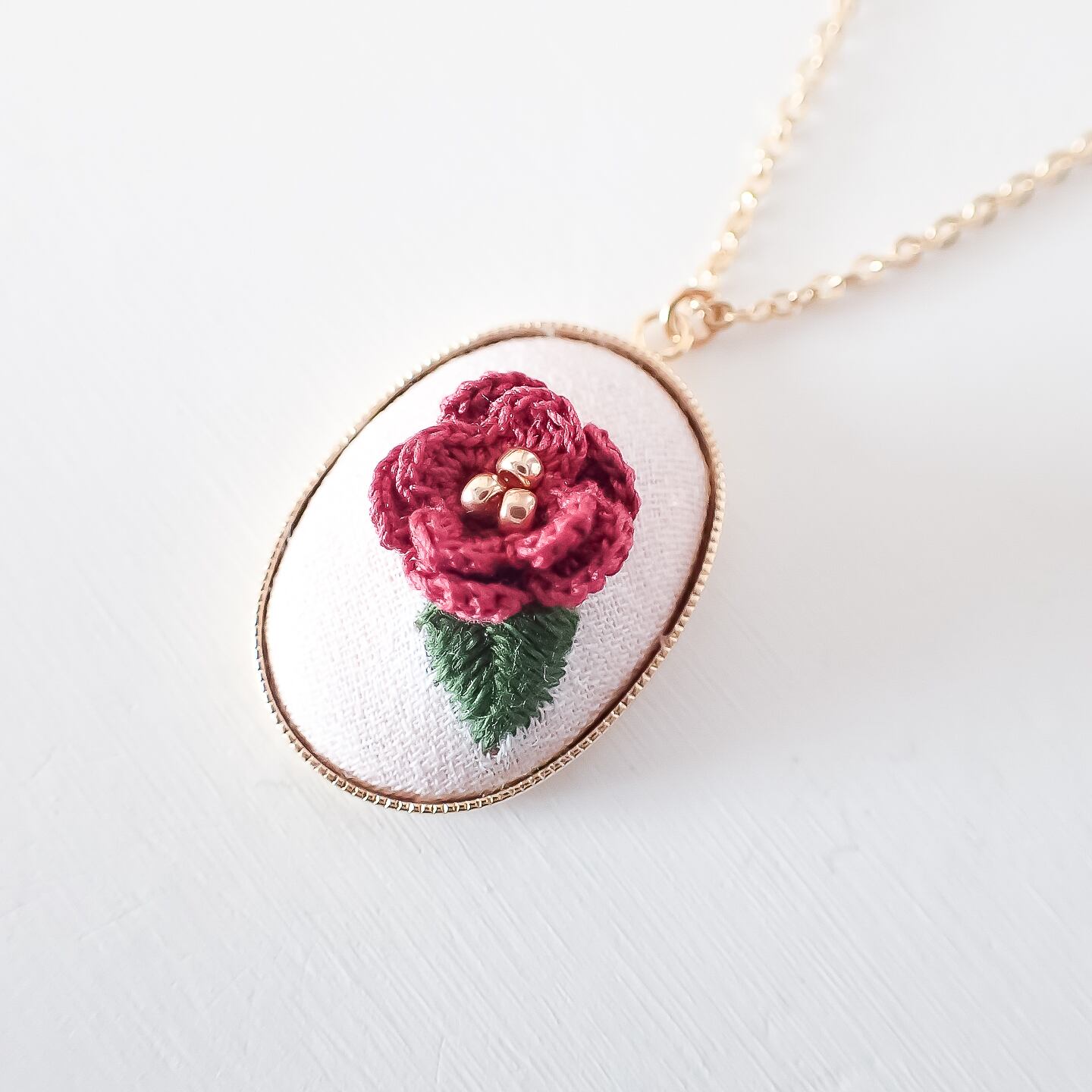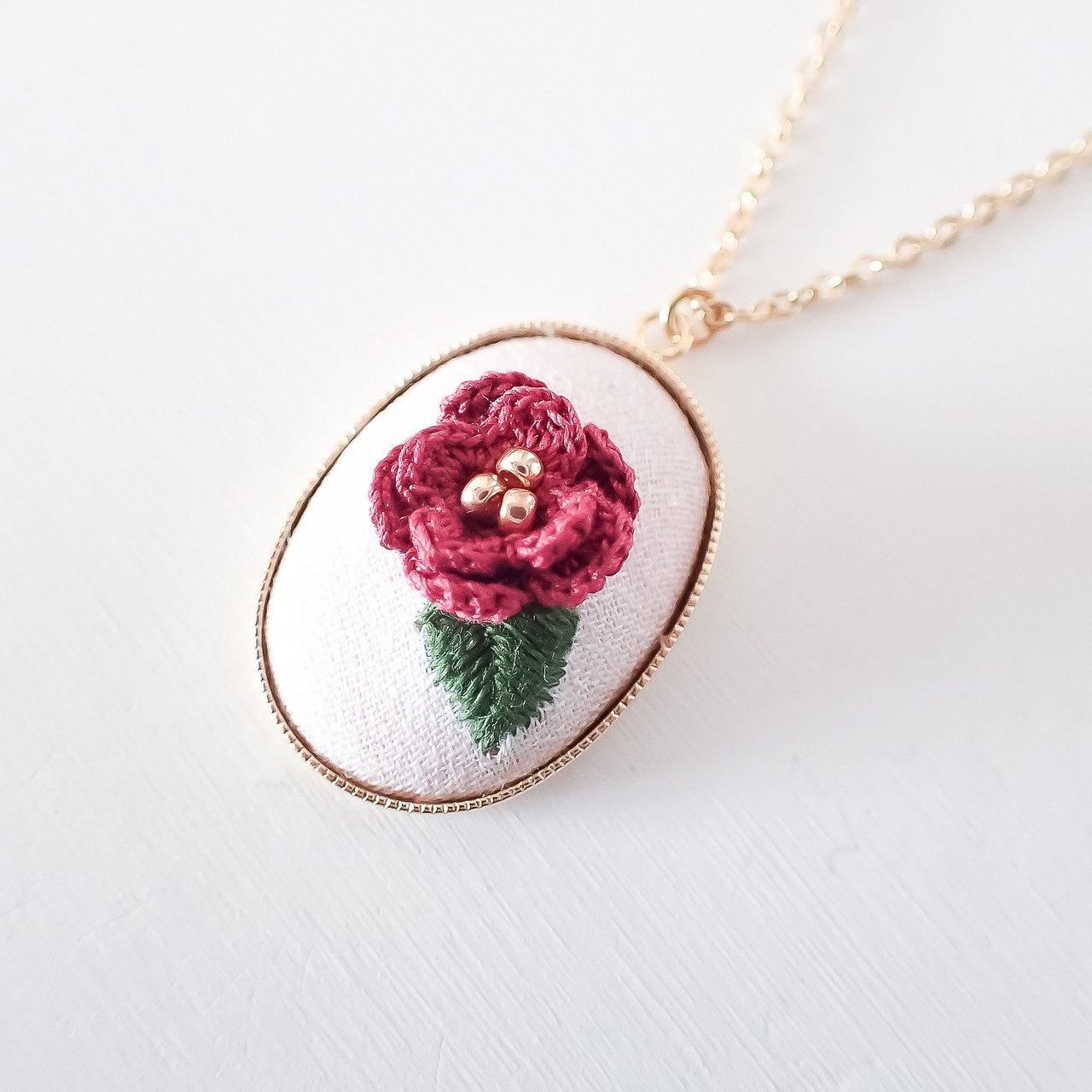 クロッシェモチーフの椿と刺繍の葉を合わせたネックレスです。