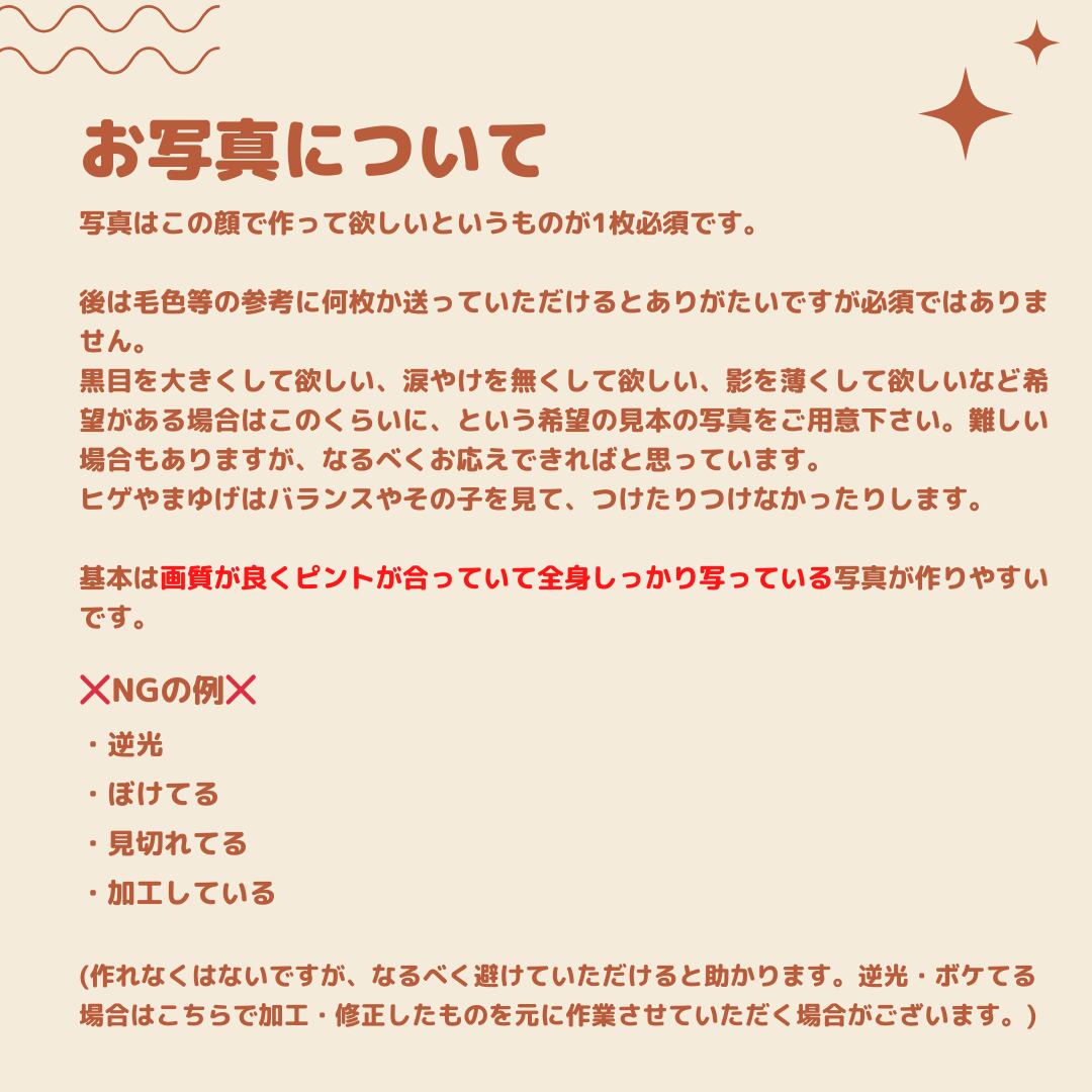 ひとつの作品にとても時間がかかってしまうためお急ぎのご依頼、期日あるご依頼のご希望には添えない可能性がございます。ご了承ください。