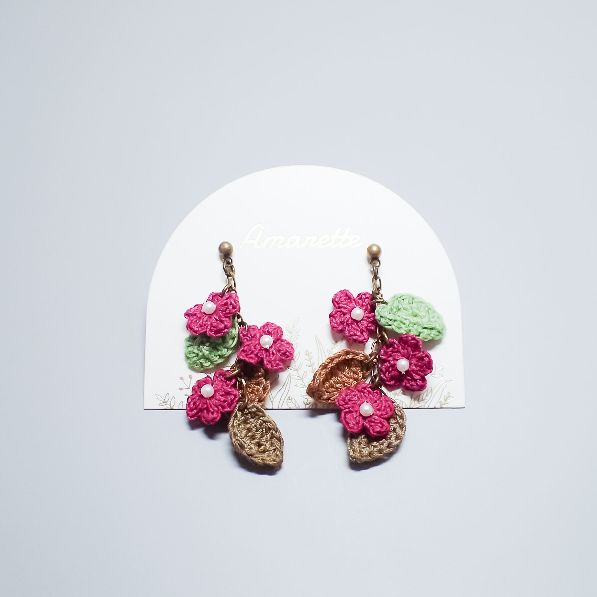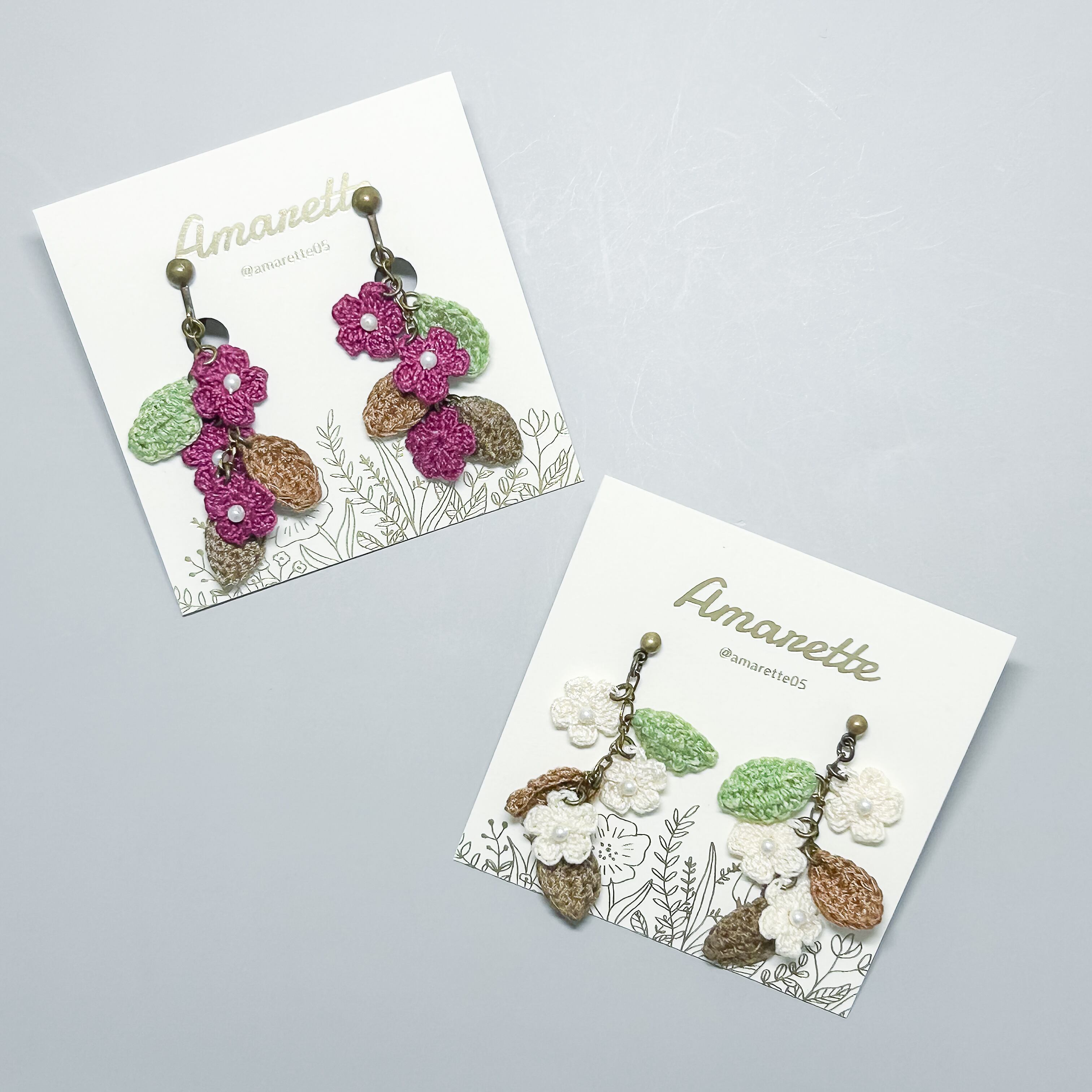 レース糸で編んだモチーフを集めたピアス/イヤリングです。