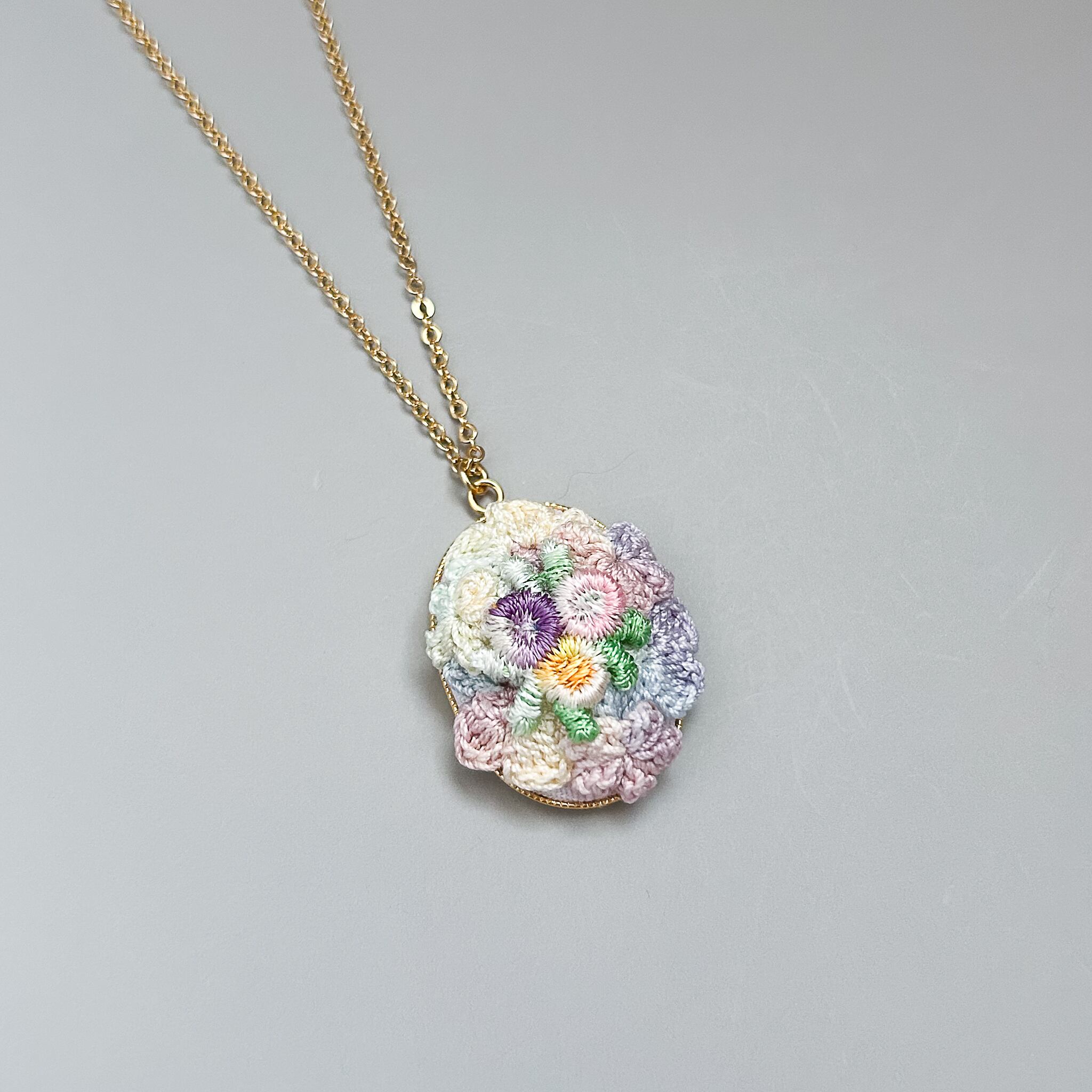 クロッシェモチーフの花と刺繍パーツを合わせたネックレスです。
